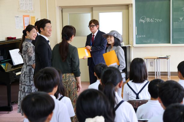 10月3日(金曜日)、野洲市長様、野洲市議会議長様、野洲市教育委員会教育長様のお出迎えで女王殿下が本校を御訪問されました。学校長および、びわ湖ホール館長様による概要説明を御聴取された後、音楽室にてびわ湖ホールによる「ふれあい音楽教室」(6年1組)をご視察されました。びわ湖ホールオペラ歌手によるご指導で子どもたちの歌声がみるみるうちに声量や表情が変わっていきました。最後に「ふるさと」を彬子女王殿下も児童らと合唱していただきました。授業後のおふれあいの時間では児童らと御歓談され、「音楽は好きですか?」「今日の授業を今後に生かしてくださいね。」と優しく声をかけられていました。