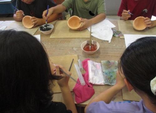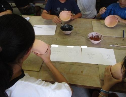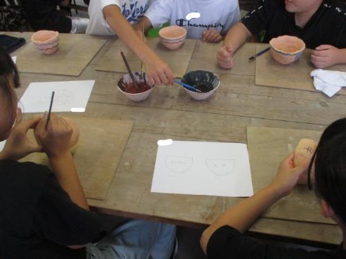 子どもたちに感想をきいてみると、「絵をかくのが思ったより難しかったです。」「イメージ通りできました。」「焼き上がりが楽しみです。」など返ってきました。絵付けができた抹茶茶碗は、もう一度、ゆう薬をつけて窯に入れて焼いていただきます。まだまだ暑い日が続きますので、窯での作業はとても大変だそうです。本当に、お世話になります。西郡先生よろしくお願いします。
