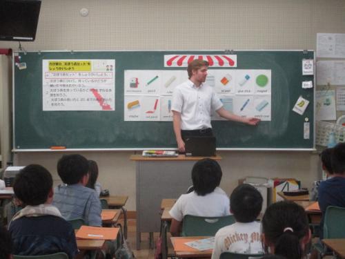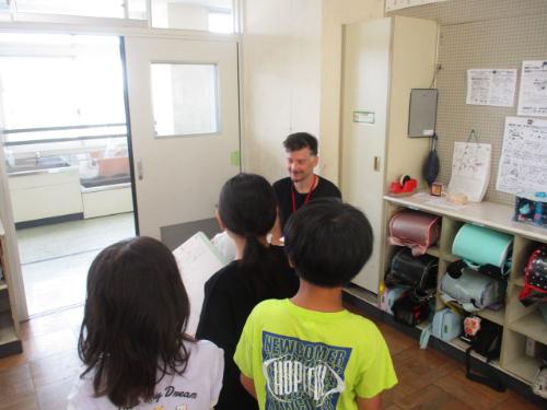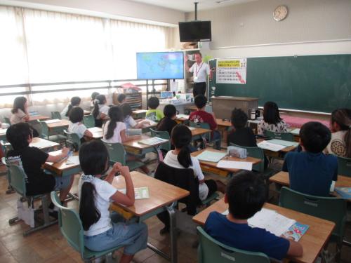 4年生では、4時間目にALTのパトリック先生と一緒に英語を学びました。最初にパトリック先生より自己紹介がありました。パトリック先生の故郷アメリカのミネソタ州には、ショッピングセンターの中に遊園地や水族館があることや北海道の大きさぐらいの湖があることなどに子どもたちは、大変驚いていました。