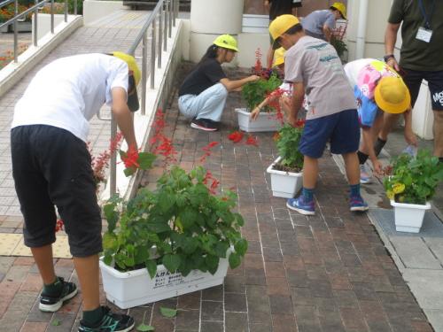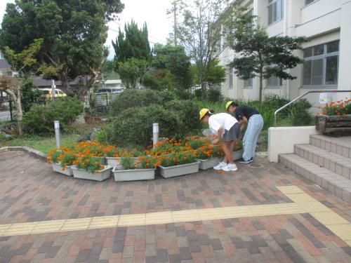 1学期から環境委員会や人権委員会を中心に3つの花を育てています。夏休みは、地域の方にも水やりを助けていただき、花がきれいに開花しました。
