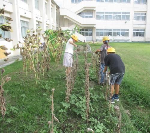 3『ひまわり』…東日本大震災の福島の復興シンボルであるひまわりを育て、種を福島に送り返すという福島の復興を支える活動に取り組んでいます。ひまわりの花は、咲く時期が終わり、種ができて重くなって頭がさがってきました。9月8日の委員会活動で花の部分をはさみで切り取りました。十分に乾燥させて種をとり、福島に送りたいと思います。