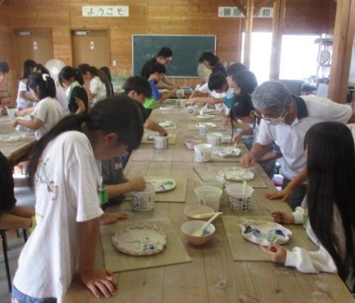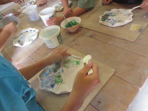 4年生篠原焼体験第2弾!として、1学期作成したお皿にガラスを入れていく作業をしました。