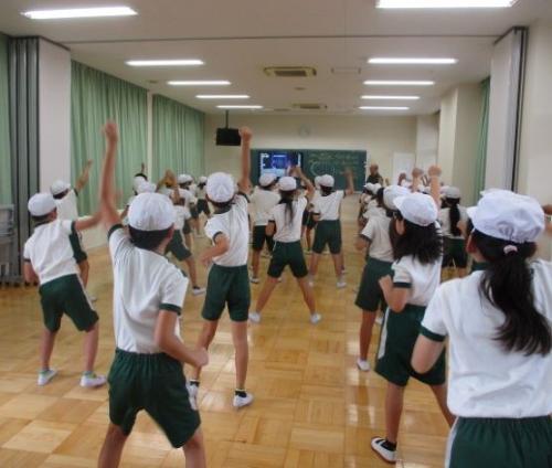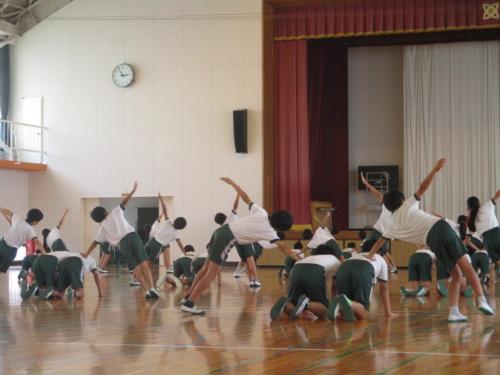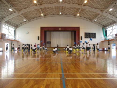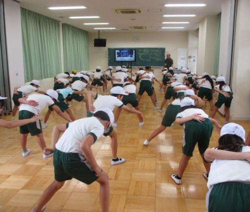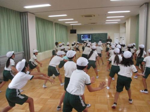 3,4年生の団体演技『よさこい』では、先週から冷房が入る多目的室で練習を開始しています。今日の目標は、「一通りのうごきをおぼえる」です。まだ、練習がはじまったところなのに、振り付けを覚えている子どもたちが多くて、びっくりしました。入場してきたときの「かまえ」の姿勢がとてもかっこいいです。その調子で、個々で動くところや仲間とあわせるところなど、これからの動きに少しずつ慣れていきましょう。そして、自信をもって、さあ、チャレンジです!!