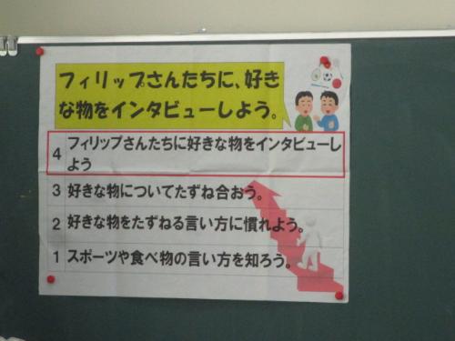 3年生外国語活動の学習のめあては、『フィリップさんたちに好きなものをインタビューして、フィリップさんたちのことをよく知ろう。』です。今日は、イギリス出身のフィリップさん、カナダ出身のマットさん、タイ出身のアンペールさん3名のゲストの方にきていただきました。子どもたちは、グループにわかれて、一人ひとりが「What do you like ~」 「好きな動物は何ですか。」「好きなスポーツは何ですか。」など、英語でインタビューしました。好きな食べ物では、お寿司が人気ありました。グループで協力しながら、英語でのコミュニケーションを楽しんで活動していました。