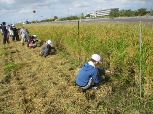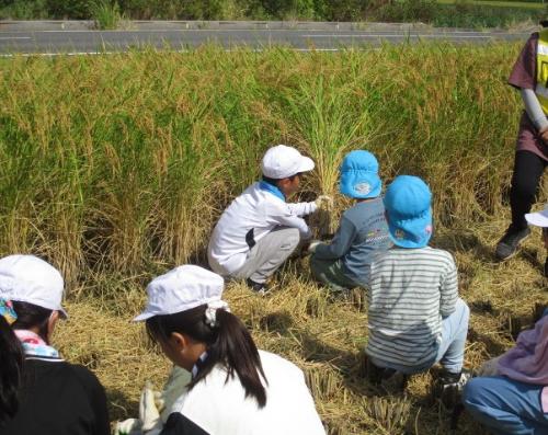 最初に5年生の子どもたちが地域の嶋村さんの説明をきいて、鎌での稲刈りに挑戦しました。鎌の安全な使い方や刈り取った稲の束ね方を教えていただきました。子どもたちは、鎌の使い方にすぐに慣れて、「つかれた~」といいながらも、最後までがんばって収穫しました。次に5年生の子どもたちが5歳児さんに「こうやって、刈るよ」とやさしく声をかけながら、みんなで協力して作業を終えました。