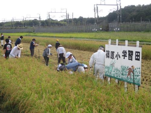 今日も汗ばむ暑さの中での稲刈りでした。5年生の子どもたちは、篠原こども園の5歳児さんと交流し、一緒に「篠原糯」を収穫しました。