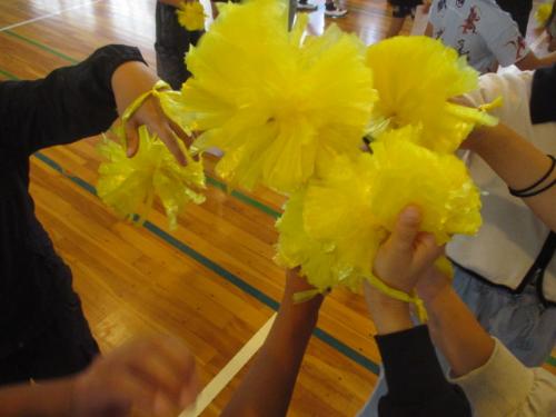 6年生の応援リーダーさんがみんなに「もっと大きな声をだしましょう。」「応援歌を覚えてきてください。」など、よびかけていました。各色手作りの応援グッズもあり、本番の応援が盛りあがりそうです。6年生のみなさん、準備ありがとうございます。