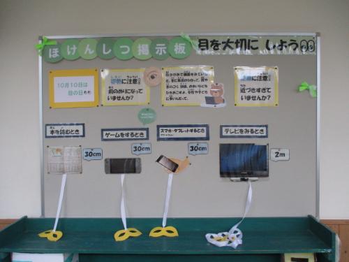 保健室前の掲示物には、「姿勢に注意!前のめりになっていませんか?」「前かがみで画面をみていると首に負担がかかって、肩や首のこり、頭痛、めまいなどをひきおこします。本や画面を見る時の距離に注意しましょう。」と実際に、本や画面を見る時の距離が体験できるようになっています。本を読むときやゲームをするとき、テレビをみるときの距離を確認している子どもたちの姿がみられます。今日は、目の健康を守る大切さについて考えてみましょう。