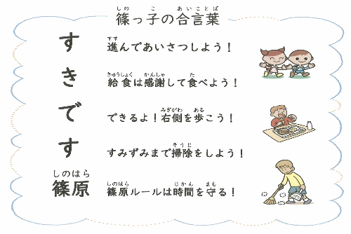 4つめ「篠っ子の合言葉」にみんなで取り組み、100%達成をめざします。