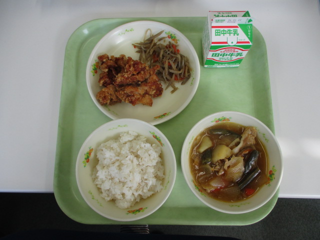 野洲市では、1月19日~23日までが給食週間です。給食週間中は特に、普段何気なく食べている給食や食事についてみんなで考え、給食でお世話になっている人たちや、食べ物に感謝して給食をいただきましょう。今日の給食は、中主中学校の中学生考案の献立でした。内容は、「むぎごはん、牛乳、とりのから揚げ、きんぴらごぼう、肉じゃが」です。みんなが食べやすく、栄養バランスもとれた献立を考えてくださっていますので、残さず感謝して食べましょう。
