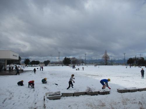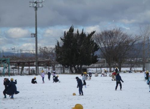 朝、学校へ来たら運動場一面に雪が積もり真っ白になっていました。休み時間には、運動場にでて走り回ったり、雪合戦をしたり、雪だるまをつくったりして、雪の触感を感じて楽しんでいる子どもたちの姿がみられました。友だちと協力して大きな雪だるまにチャレンジするなど、夢中で遊んでいました。