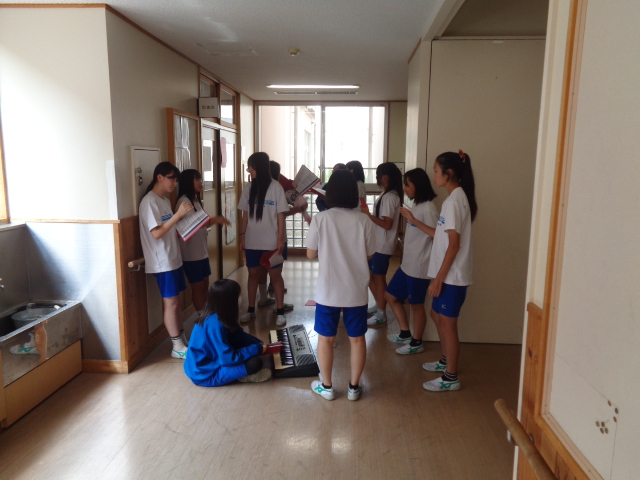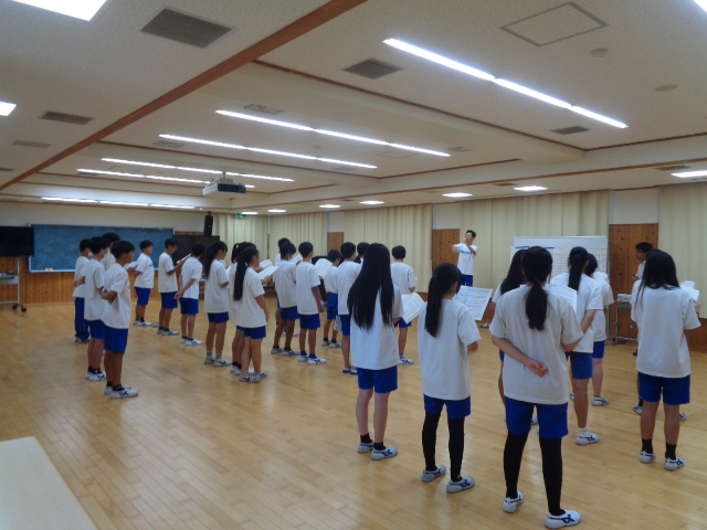 3年生が夏休みから準備を進めてくれている体育祭の団アピールの練習が始まりました。初日なので、3年生が1.2年生の各教室や廊下にダンスを教えに行きました。3年生は中学校生活最後の体育祭になるので、その思いも強く、丁寧に1.2年生に教える姿が印象的で、とても頼もしく見えました。先輩の言葉や動きを見本に1.2年生たちも真剣な表情で覚えていました。本番当日の演技が楽しみです。