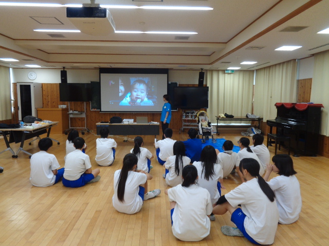 2,3時間目に3年生家庭科の授業で、赤ちゃんと一緒に出前授業の取組「ハグベビー」が行われました。この日の先生は、小さな「赤ちゃん先生」で、生徒は命の大切さや性についての理解を深めることができました。赤ちゃん先生を前にするとこれから受験期を迎える3年生も表情が緩んでにこやかになり、ホッとする瞬間をみんなで共有することもできました。10月3日にも実施する予定です。
