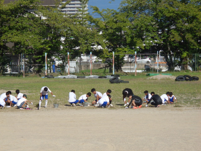 台風が過ぎ去った影響か、活動しやすい暑さの中での作業になり2トントラックいっぱいの草を抜くことができました。生徒もサッカー部、ソフトボール部、野球部、卓球部、女子バスケットボール部、ソフトテニス部が参加してくれました。当日には参加できないからとラグビー部と陸上部は昨日に草を抜いてくれました。また、有志で日ごろから除草作業をしてくれている生徒もいて、本当にうれしいです。体育祭に向けての除草作業ですが、生徒の気持ちの中に「私たちの学校」という気持ちが強く感じられることに頼もしく感じている毎日です。