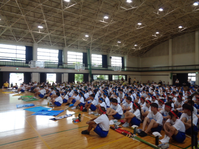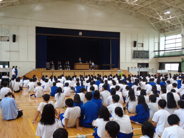 2学期がスタートしました。まだまだ暑い体育館で始業式をしました。(体育館の冷房はいつになったら設置されるのか)アッという間の夏休みでしたが、生徒の皆さんは元気に登校してきてくれました。式では校長から「心を入れ替えて頑張ること」の実践目標について話がありました。また、表彰伝達で夏休み中の活躍を称えました。1、2年生はその後、課題テストに臨みました。夏休みの学習の成果は出せたでしょうか。2学期は大きな行事が続きます。体育祭では最高の団アピールを、文化祭では合唱コンクールで最高のハーモニーを期待しています。