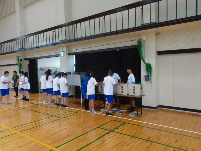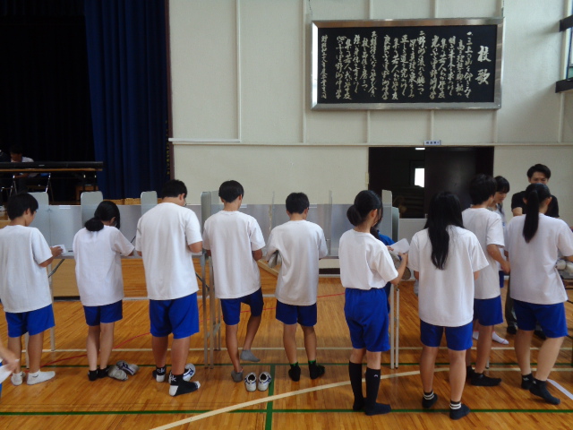 5校時に野洲中学校生徒会の新しいリーダーを決める立ち合い演説会を体育館で行いました。会長候補には2名、副会長候補には3名の生徒が立候補し、選挙公約について熱く演説をしてくれました。どの候補者も野洲中学校の学校生活を良くしていこうとする気持ちが言葉に表れており、本当に頼もしく思えました。演説の後、投票をする生徒の表情にも真剣さが見られ、「一人ひとりが生徒会員」の自覚をもって投票していました。今回の選挙には野洲市選挙管理委員会(市役所)から実際の選挙時に使う投票箱と記載台を借りて実施し、選挙権を得たときのリハーサルもできたと思います。