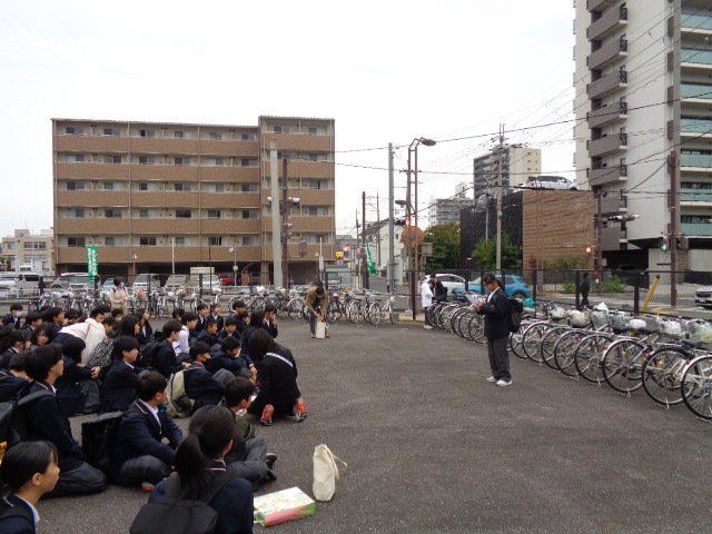 10月31日に1,2年生の校外学習を実施しました。1年生は大津市内で京阪電車を利用して班別自主研修を行い、次年度の校外学習や3年次の修学旅行に向けての練習ができたと思います。2年生は大阪で企業訪問と班別自主研修を行いました。2年生は1学期に職場体験学習を経験しましたが、大阪の大企業で研修を深め、これからの自分の将来を考える学習になったと思います。今後それぞれの学年で事後学習に取り組みます。写真は出発式の様子ですが、それぞれの学年の写真は、学年通信や学級通信に掲載しますので、そちらをご覧ください。