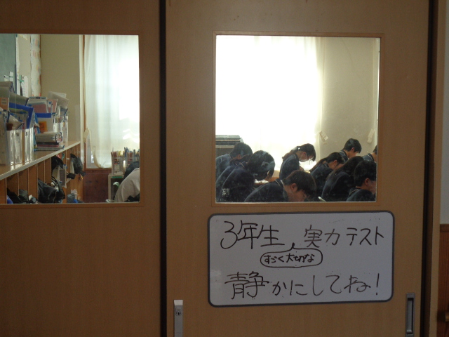 3年生の実力確認テストを実施しました。今回のテストも進路実現に向けて大切なテストなので、どの生徒も真剣な表情で問題を解いていました。教室から伝わる真剣な空気に、教室に入ることはできませんでした。がんばれ、3年生!