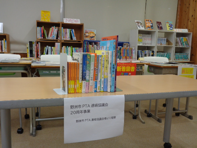 PTA連絡協議会から本の寄贈がありました。これは野洲市PTA連絡協議会の20周年事業の一環です。本校のPTAは昨年度末に解散しましたが、このように地域や保護者の方の支援を受けて様々な教育活動を行っています。本は登録が終われば、図書室に置かれるので、この機会に図書室に行ってみましょう。