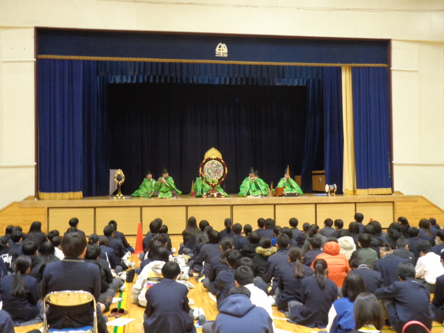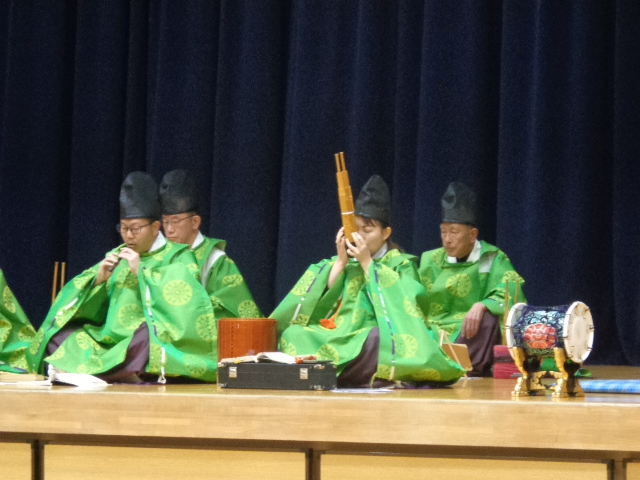 6時間目に地元の雅楽演奏楽団「小篠原楽人」様に来ていただき、雅楽「越天楽」を鑑賞しました。笙(しょう)や篳篥(ひちりき)など、普段耳にすることがない楽器の音色に聞きほれました。演奏していただいた全員が本校の卒業生ということでしたので、このご縁が来年も続けばいいなあと思いました。