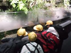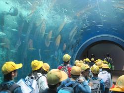 水族館では、班ごとに見学をしました。この日は、大変多くの学校や園が同じく見学に来ていました。集合時間や班の仲間がそろっているかということを気にしながら、行動していました。その後、イルカスタジアムでみんなでお弁当を食べて帰校しました。