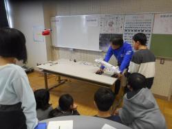 1月29日(木曜日)、30日(金曜日)に、野洲市市三宅に開校予定の滋賀県立高等専門学校の先生方が、理科の授業をしてくださいました。子どもたちは、学校の紹介(学習内容など)を聞いた後、実験に参加しました。実験は、ある一定の高さから落ちるおもちゃのりんごにピンポン玉を当てるという実験です。りんごが落ちると同時にピンポン玉を発射するのですが、どこに向かって玉を発射すると、落ちてくるりんごに当たるのかを予想しながらそれぞれが試しました。何回かやっていくうちに「りんごの最初の位置をねらって発射するとよい」と気づきました。それは正解で、実験後、先生からその理由について説明を聞きました。なぜそうなるのか、説明できることが大事であることを教えていただきました。