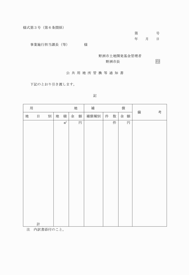 第3条 基金により取得される土地を事業に必要な土地に充てようとする事業施行担当課長等は、毎会計年度当初に土地需用計画書(様式第1号)を作成し、市長に提出しなければならない。