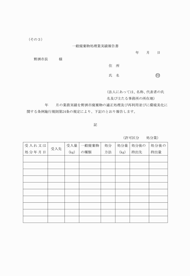 第21条 許可業者は、一般廃棄物処理業許可申請書に記載した事項を変更したときは、一般廃棄物処理業許可申請事項変更届出書(様式第12号)を、変更の日から10日以内に、市長に提出しなければならない。