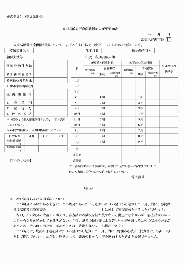 (2) 保険料の額の変更が生じた場合 後期高齢者医療保険納入変更通知書(様式第2号)