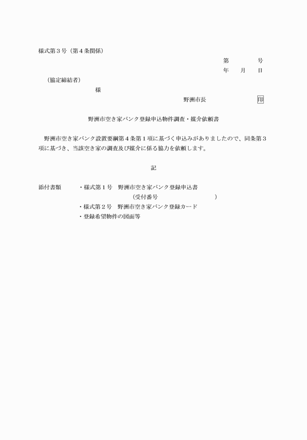 第4条 空き家バンクに空き家に関する情報を登録しようとする所有者等(以下「物件登録希望者」という。)は、野洲市空き家バンク登録申込書(様式第1号)に次に掲げる書類を添えて、市長に提出するものとする。