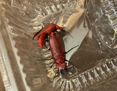 ヒラズゲンセイは一見すると赤いクワガタムシのような印象を受けますが実際にはクワガタ科ではなくツチハンミョウ科の昆虫です。ツチハンミョウ科の昆虫の体や脚の関節から分泌する黄色い体液には有毒物質が含まれ、皮膚に付くと炎症を起こしたり、水ぶくれができる可能性があります。発見しても触らないようにしてください。